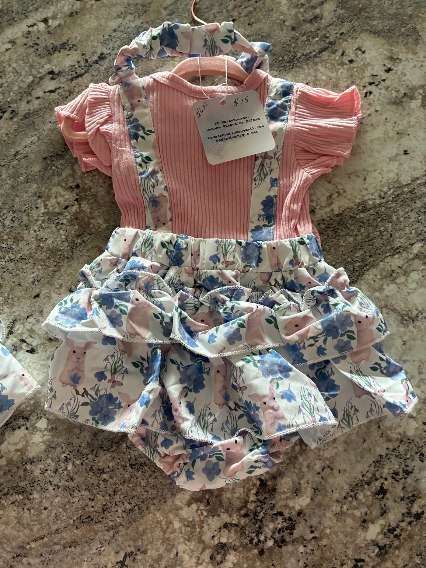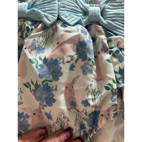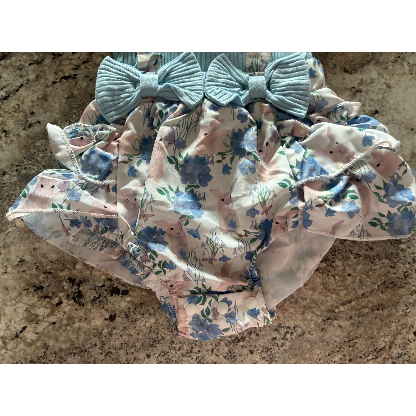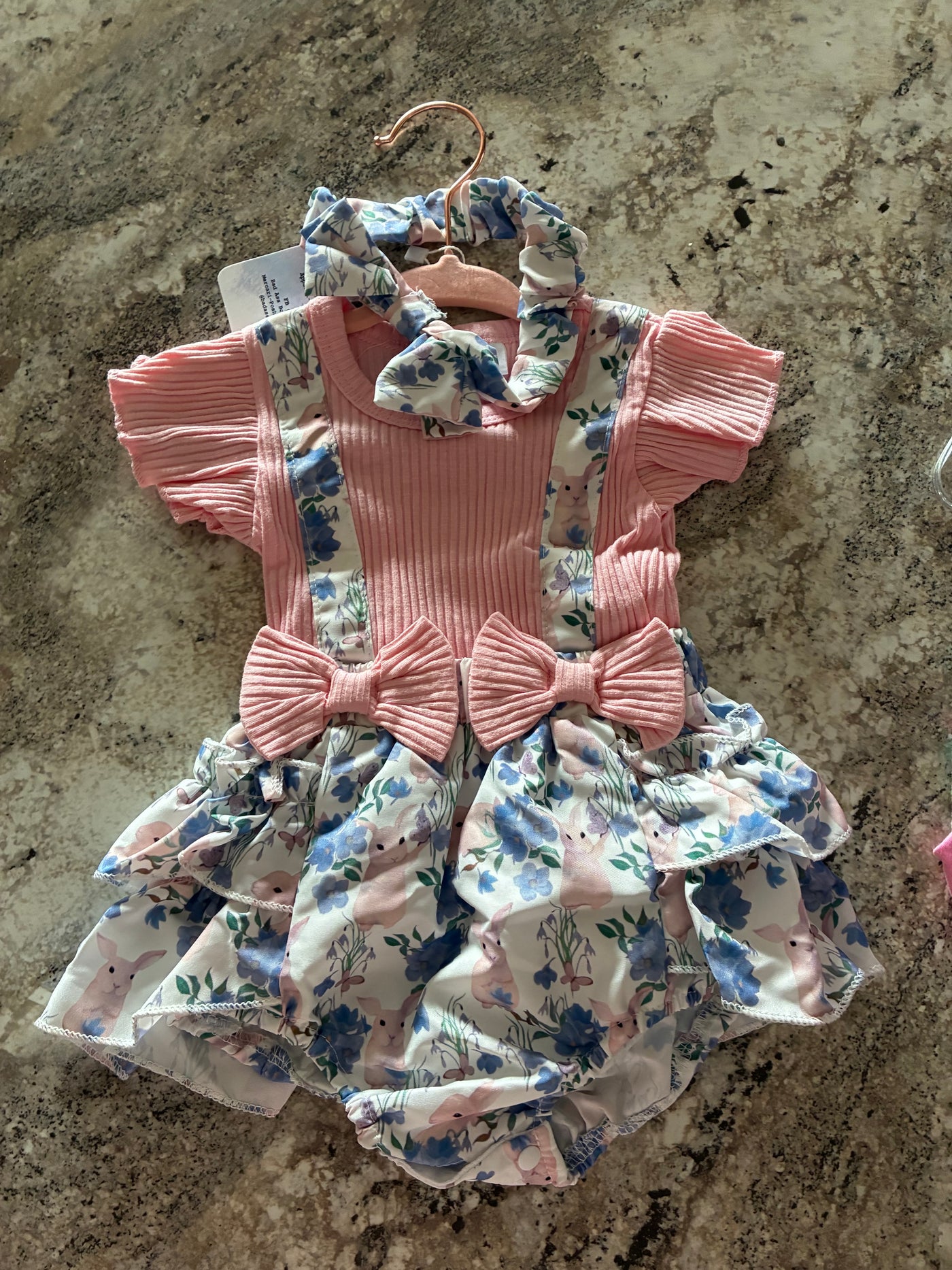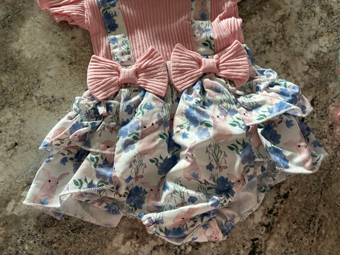 Meticulously crafted infant romper featuring a delicate blend of ribbed texture and whimsical bunny-themed floral print. Designed for comfort and style, this ensemble offers a charming aesthetic with flutter sleeves and coordinated bows.