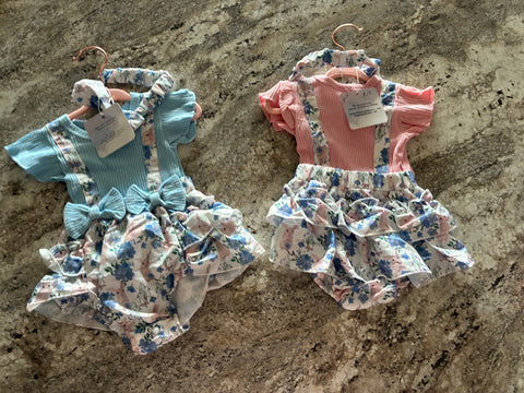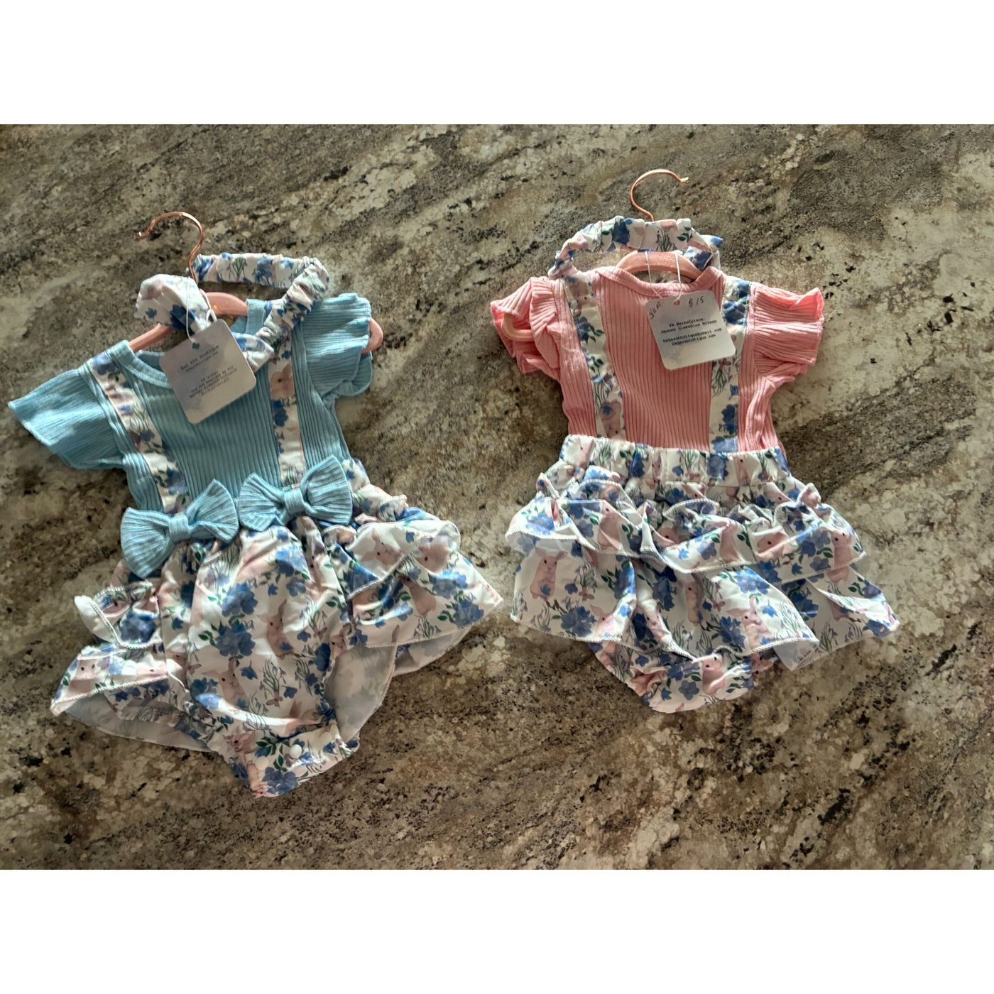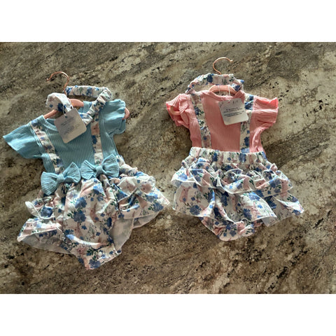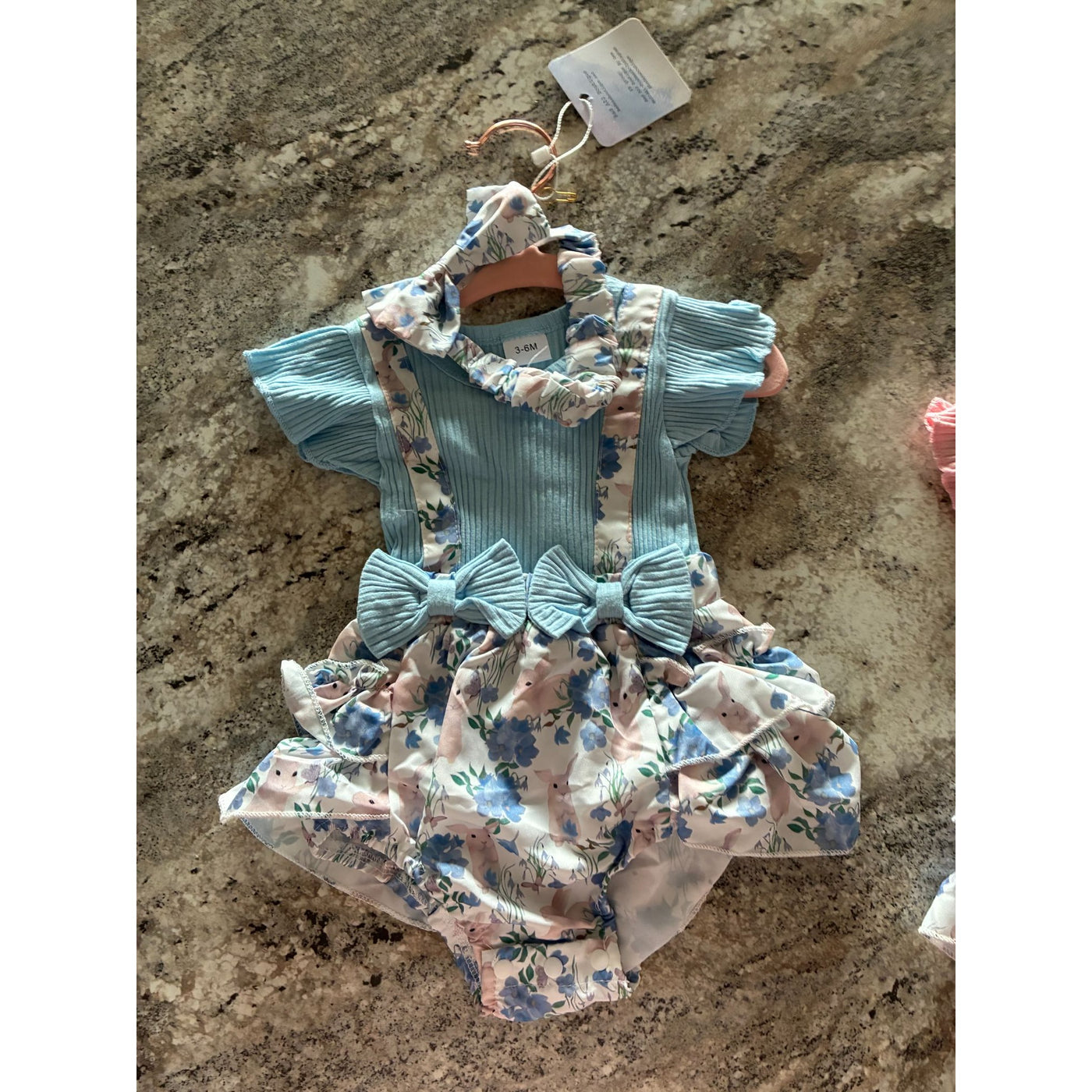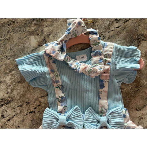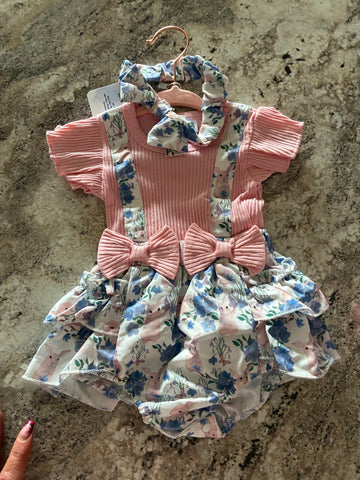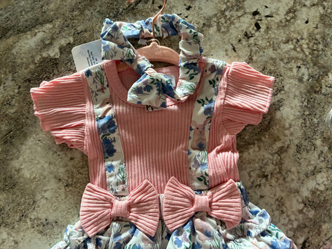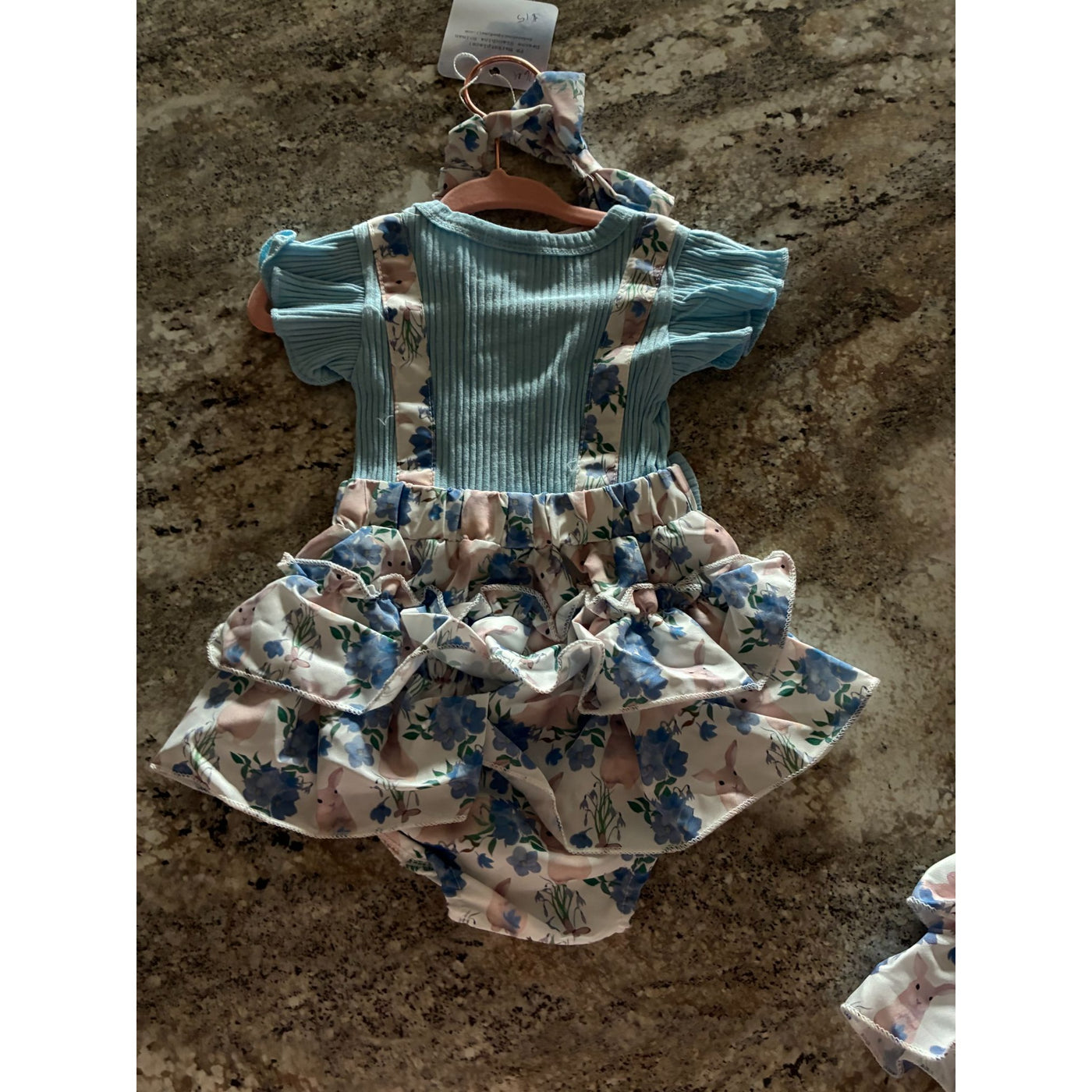 Meticulously crafted infant romper featuring a delicate blend of ribbed texture and whimsical bunny-themed floral print. Designed for comfort and style, this ensemble offers a charming aesthetic with flutter sleeves and coordinated bows.