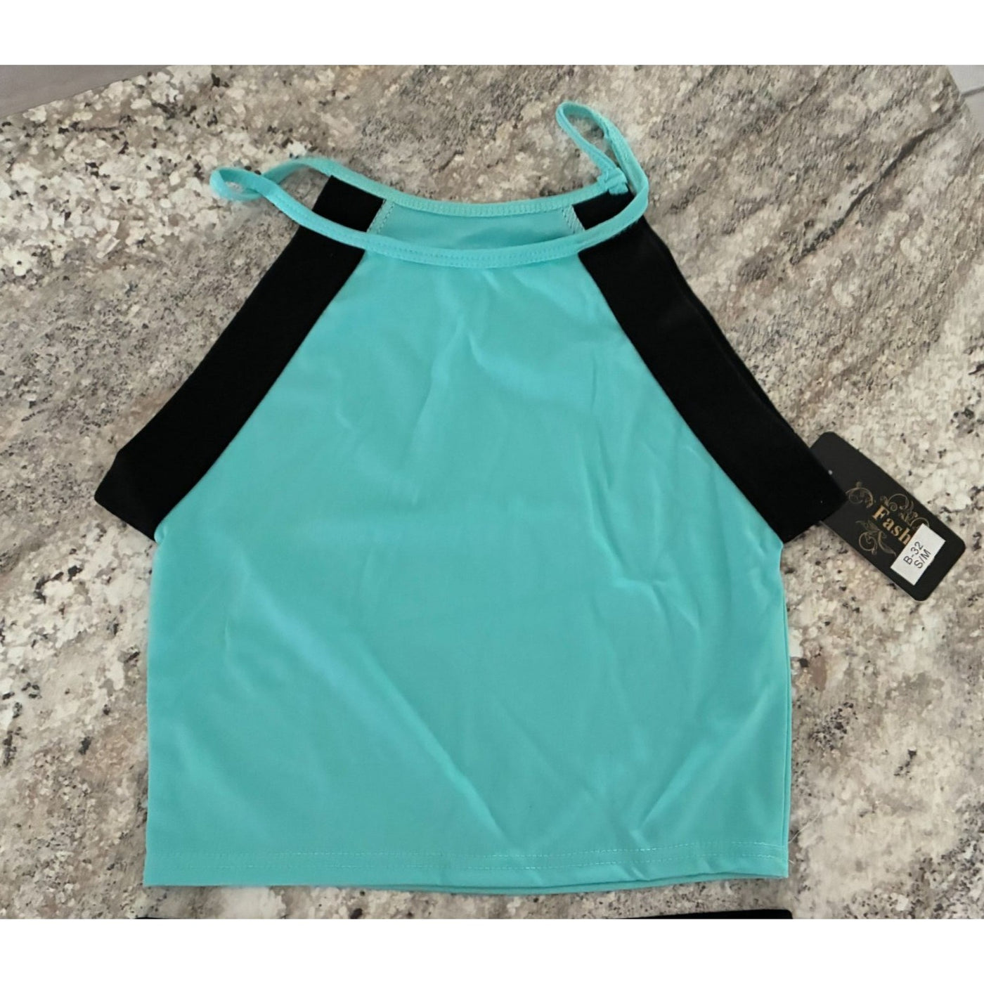 • Halter neck design with contrast black panels