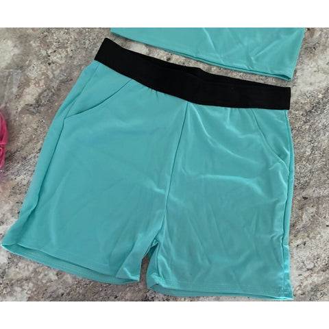 Designed for the active professional seeking stylish and functional athletic wear. The coordinated set offers a sleek halter top and matching shorts with strategic color blocking and a comfortable fit for various fitness activities.