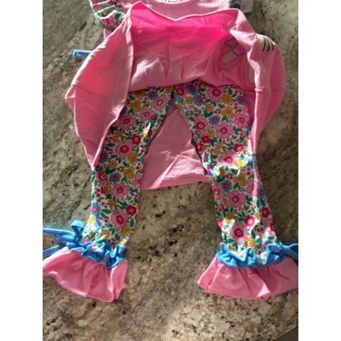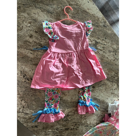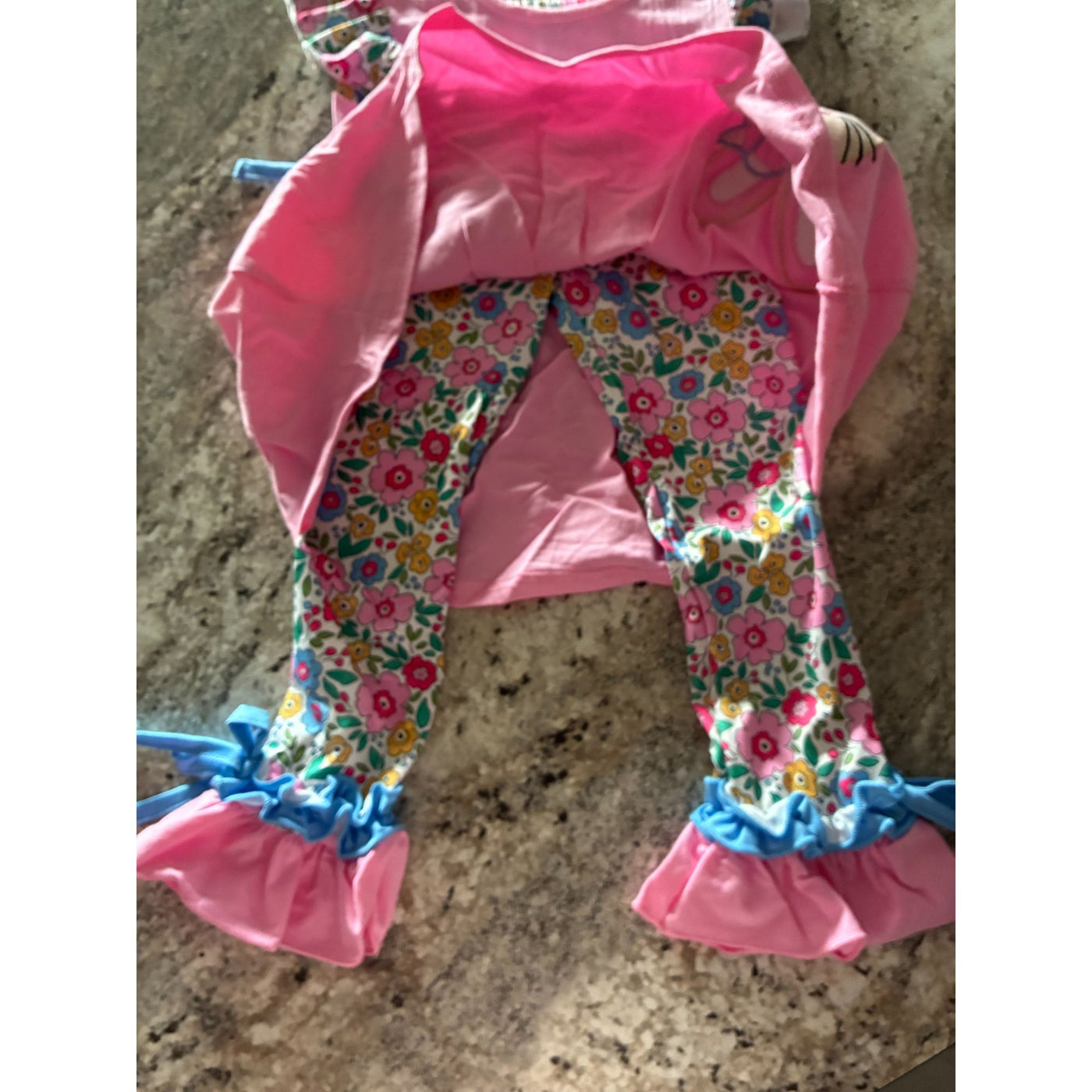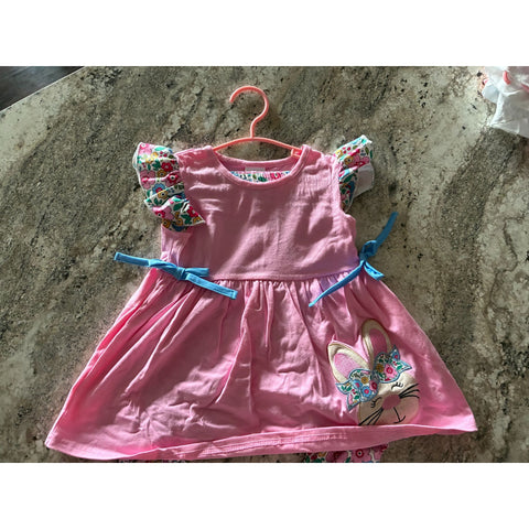 A charming ensemble designed for young girls, featuring a soft pink cotton dress with delicate flutter sleeves and a whimsical bunny applique. Paired with coordinating floral-print leggings trimmed in blue ruffles, this outfit balances playful design with refined details.
